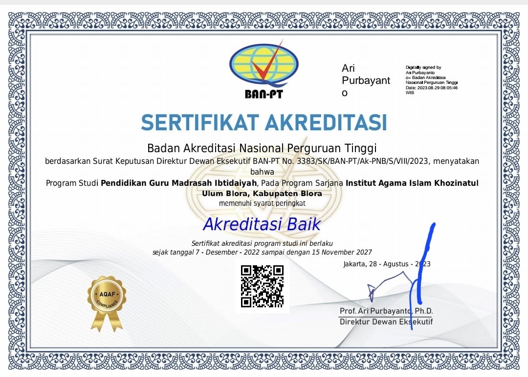 Alhamdulillah, Puji dan syukur hanyalah kepada Allah, Rabb semesta alam, Pencipta sekaligus Pemelihara Yang Maha Sempurna yang telah memberikan nikmat dan sempat kepada kami sehingga Prodi PGMI IAI Khozinatul Ulum Blora terus berkembang, dan meraih berbagai rekognisi. Prodi PGMI IAI Khozinatul Ulum Blora sebagai lembaga pendidikan telah menunjukkan komitmennya untuk terus menjadi yang terbaik dalam memberikan pendidikan berkualitas yang relevan dengan kebutuhan masyarakat. Untuk mencapai standar kualitas pendidikan tenaga guru Sekolah Dasar dan Madrasah Ibtidaiyah yang relevan, kami terus melakukan upaya terbaik untuk menyediakan lulusan dengan proses pembelajaran yang unggul, materi kuliah yang mutakhir sesuai dengan Kurikulum KKNI, dan sumber daya manusia profesional untuk memberikan pengetahuan, keterampilan dan sikap yang berlandaskan nilai-nilai Islam, berwawasan ke-Indonesiaan dan kearifan lokal.