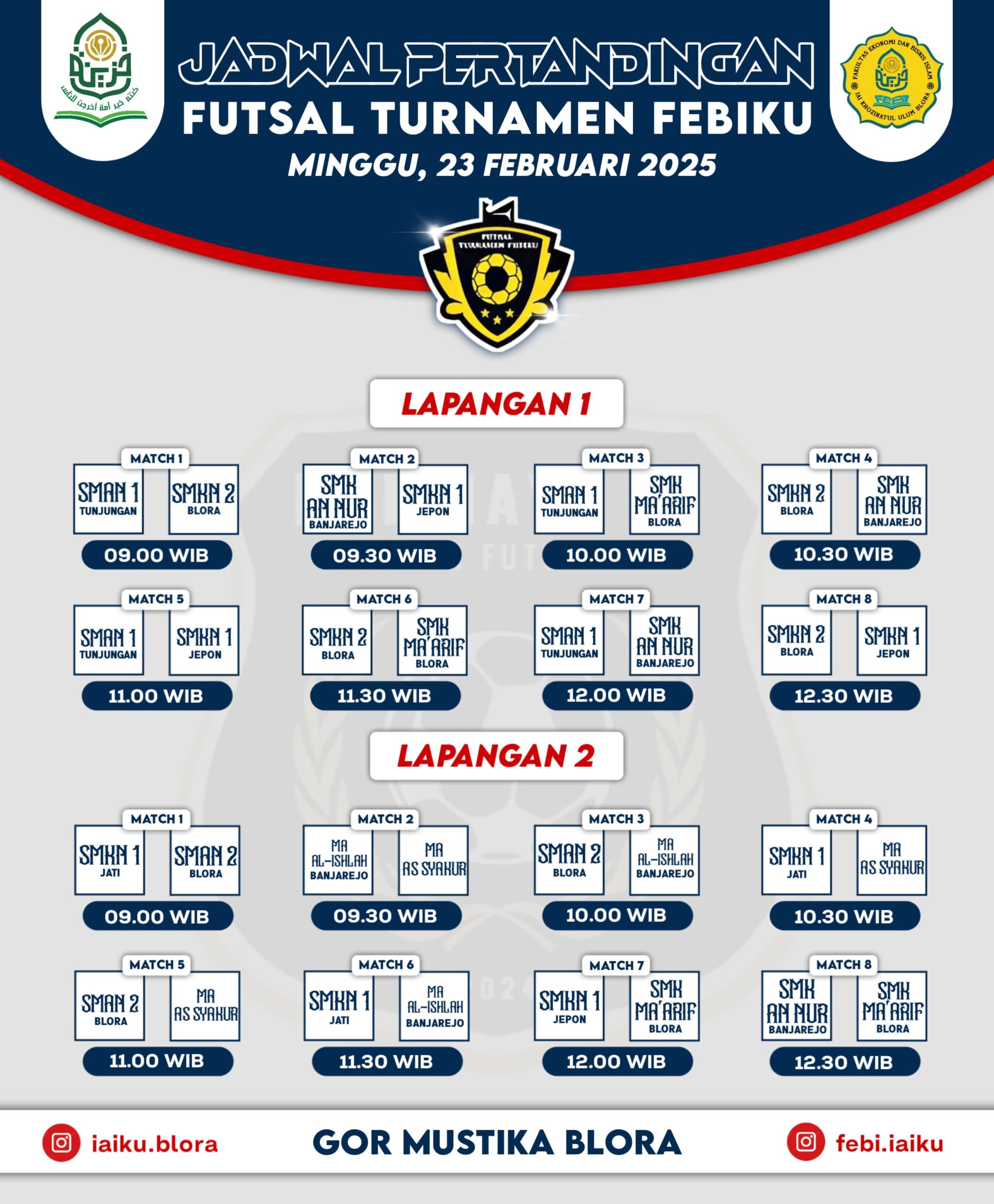 IAkuipers - Futsal tournament titled Febiku was immediately held at GOR Mustika Blora on Sunday, 23 February 2025. The match in the preliminary round will be held in two fields simultaneously, Starting at 09.00 WIB until the o'clock 12.30 WIB.
